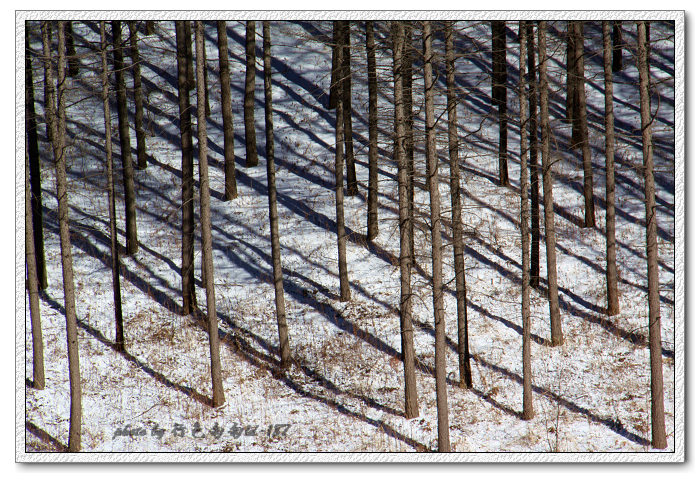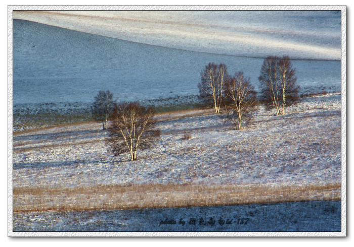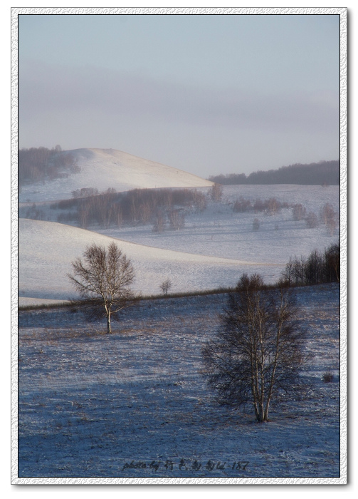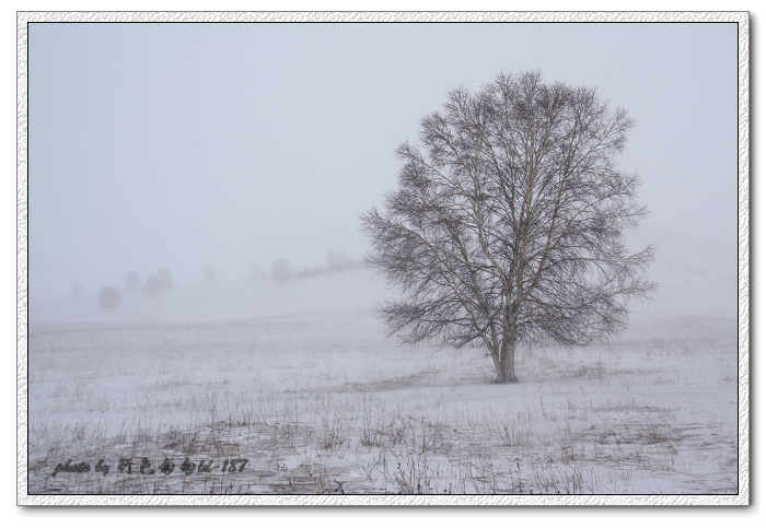 这种朦胧,是风雪形成的。整辑照片中凡是朦胧都是风雪所致,并非拍摄不清。因为当时我在坝上遇到暴风雪,天下着雪加上大风刮起地上的雪搅得漫天雪飞,我呆在坝上三天,除了第三天停风雪外,其余两天都是整天时而大风雪、时而飘小雪并偶有阳光,那种冷的滋味真的难以忍受。(我在以前的日志《超级发烧友》中描述过)